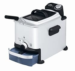 For cooking restaurant-quality fried foods at home, this professional-style deep fryer can hold 3-2/7 liters (approximately 14 cups) of oil and offers an extra-large fresh-food capacity of 2-2/3 pounds. Its generously sized frying basket can accommodate almost any type of food--from delicious French fries and onion rings to mozzarella sticks and doughnuts. The unit provides an adjustable thermostat and a temperature-ready light that indicates when the oil has reached the correct frying temperature. Even more, users never have to touch the oil thanks to the unit's automatic oil-drainage and filtration system. It drains filtered oil into an integrated oil container, conveniently storing it for future use. The appliance also comes with a variety of safety features that include cool-touch handles on the sides and lid, an external handle that raises and lowers the basket with the lid closed, a sealed locking lid to prevent splatters, and a detachable magnetic safety plug. Other details include a viewing window on the lid, a permanent odor filter to reduce cooking odors, and 100-percent dishwasher-safe parts (except the heating element) for hassle-free clean-up. Attractively housed in brushed stainless steel, the 1700-watt deep fryer measures 19 by 13 by 16 inches and carries a one-year limited warranty.