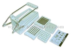 Easily make delicious French fries in your own kitchen with this jumbo-sized potato cutter from Progressive International, which is also ideal for carrots, zucchini and yams. It features two separate blades for thin or thick slicing (1/4- and 3/8-inch), and it cuts large whole potatoes in one motion. It also offers an extra-strong suction cup base to minimize slipping. The strong plastic and stainless steel frame will withstand years of slicing. The unit measures 4-1/4 by 12-1/4 by 5-1/4 inches. Blades and pusher plates are dishwasher safe; hand wash base frame.