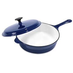 (More customer reviews)Heuck deserves lauding praises not only for the very affordable price at which amazon lists this skillet, but also for the impeccable attention to detail in their manufacture of their proven cookware. Heuck stands up to the same quality, or is, as in this case, better than Le Creuset, Calphalon, etc. Enamel Cast Iron products have been around since the Industrial Revolution because of their wide versatility ("from the fire, to the fridge, to the freezer, and back to the fire"), extremely durability, and for being such a pleasure to use. Its porcelain enamel surface is inert - does not react chemically with any food, nor at any temperature. This skillet proves its worthiness with sautéing, frying, making stews and soups, brazing or slow roasting large cuts of meat, and even for baking such goodies as cornbread and coffee cake. Product ships with instructions on how best to clean and care for skillet and its different surfaces. However, it is further recommended that, if there are cooked-on food stains and particles, let soak for at least an hour in warm water, and hand clean this product with only the mildest dishwashing liquid and dishcloth or mildly abrasive sponge, but NOT in the dishwasher. The heat/water cycles of the appliance tend to eventually wear the shine of the enamel, making it opaque and diminishing the enamel's heat retention. As with any heavy cookware, such as Pyrex (another excellent product), one must also take care not to chip or break the porcelain enamel coating on the cast iron. This color choice is a deep Persian blue (not cobalt on the exterior), and is very beautiful with ivory white in the interior. You will receive many years of great use and pleasure of this product. Happy cooking!
