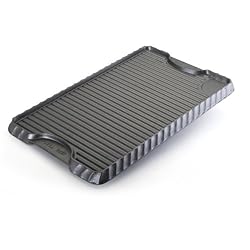 A great choice for all your griddle needs--from flapjacks and bacon for breakfast to searing steaks, chicken or fish filets for dinner--this double-sided cast iron griddle from venerable Southern cook Paula Deen is large enough to cover two burners on your stove (at 20 inches long and 12 inches wide). It features a smooth side that reverses to a ridged griddle for adding restaurant-like searing lines as well as allowing fat and juices to drip away. Made of pre-seasoned cast iron, it's ready to use right away. And the cast iron construction helps to hold the heat for slow cooking. The two rounded, inset handles on either side make it easy to grip it confidently, even with bulky potholders or mitts. Hand wash only. Backed by a 1-year manufacturer's warranty.