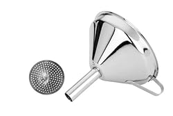 MIU France item #: 3085 polished stainless-steel funnel with strainer.Easily tranfers liquids between containers.Detachable strainer filters solids from liquids.Convenient side hook.5 inches high with a 5 inch opening. Dishwasher safe.Great for removing particles from cooking oil or filtering leaves from tea.