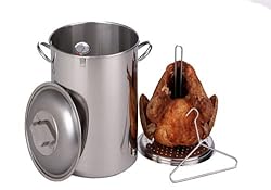 Turkeys and chickens fry quick, stay moist, and taste delicious when cooked in this turkey pot from King Kooker. This 26-quart pot holds turkeys up to 16 pounds on its sturdy turkey rack. The rack keeps the bird elevated at just the right height in the pot to absorb airborne moisture without dipping into to much of the grease at the pot's bottom. Constructed of heavy-duty stainless steel, the package includes a lifting rack, hook, lid, and deep fry thermometer. For cooking birds heavier than 16 pounds see King Kooker's 30-quart turkey pot package.