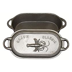 This cast iron fish fryer and casserole pot measures 16. 5 inches long x 8. 75 inch wide x 3. 75 inches deep on the inside. A fun raised crawfish motif is displayed on the lid. Althought there is a flat griddle on the underside of the lid, the crawfish does not allow it to lay flat on a stovetop. This item should be cured before use. Nonstick when seasoned. Cast iron makes for superior heat retention and even heating of foods. Heavy-Duty and durable, designed to last for years. Hand wash with stiff brush and hot water. Cooking with cast iron provides nutritional iron intake