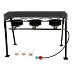 Great for tailgating, camping, or even backyard cookouts, this propane triple-burner camp stove features durable construction and a 14-by-42-inch cooking surface. From fried chicken, boiled shrimp, or steamed lobster to baked beans, fried onion rings, or jambalaya, the options are endless. Attachable interlocking legs give the unit a height of 25 inches, which makes cooking around the camp stove more comfortable. In addition, the portable outdoor cooker provides heavy-duty 54,000-BTU cast burners, a listed LP hose and regulator with a type-1 connection, and manifold and needle valves for easy flame adjustment, along with a removable windshield for protecting the flame. Accessories include three deep-fry thermometers and an instruction manual with recipes, but a propane tank must be purchased separately. CSA design certified, the triple-burner camp stove measures approximately 15 by 43 by 28-7/8 inches (with legs assembled and windshield in place) and carries a one-year limited warranty.